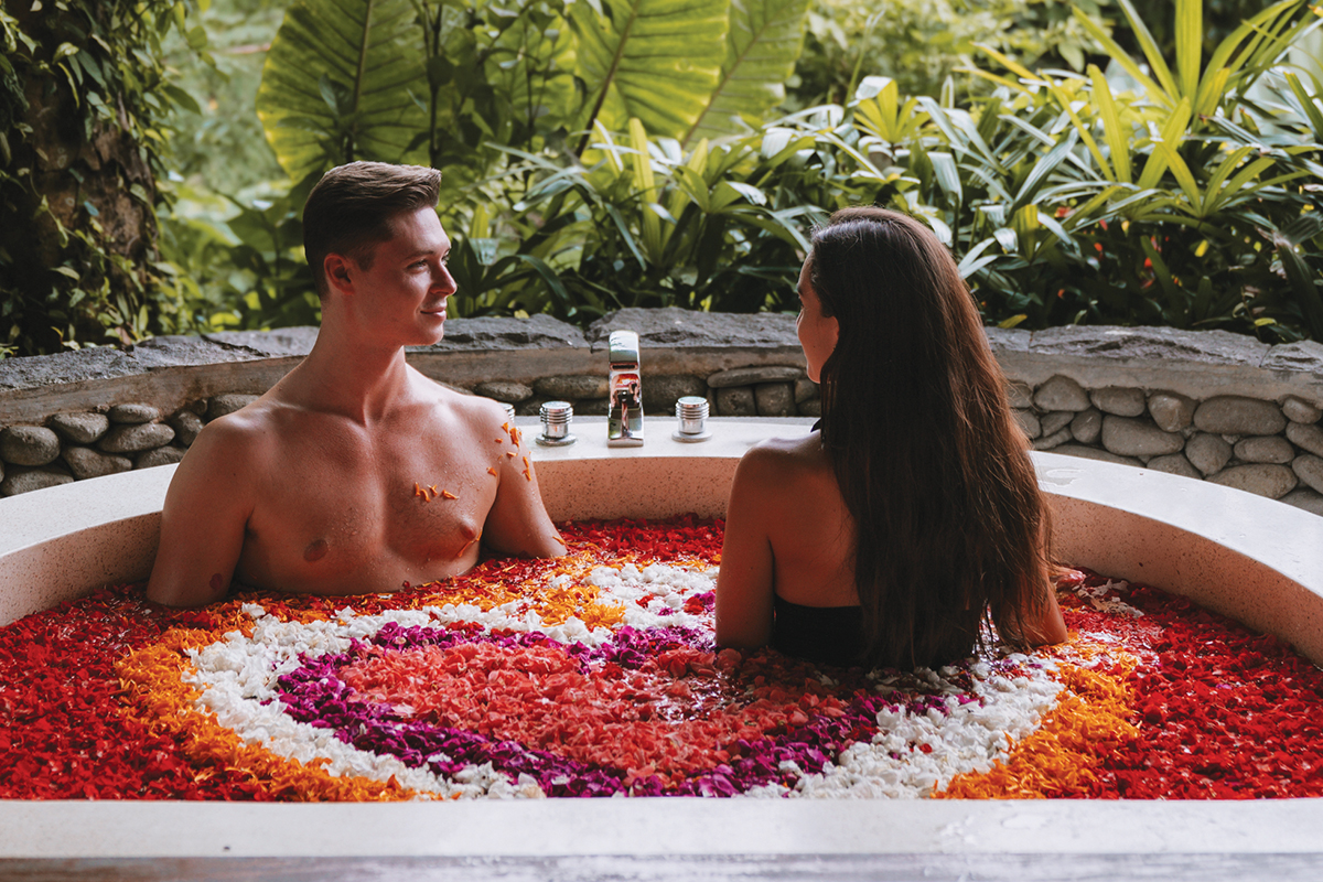 With floral whispers and the sensuality of its rhythmic movements, a day at the spa is an ideal way to spend intimate moments with one’s partner. Champaka Spa at Jannata Resort Ubud amplifies the romantic mood with its treatments, set against the verdant forests of the riverside valley terrain. Rejuvenation comes easy here with all-natural products, from facials using Pevonia skincare and yoghurt masks to green tea scrubs. One of its highlights, though, is the technicolour floral baths, inviting couples into its outdoor tub filled with vibrant blossoms with captivating designs for a romantic dip among lush greenscapes.