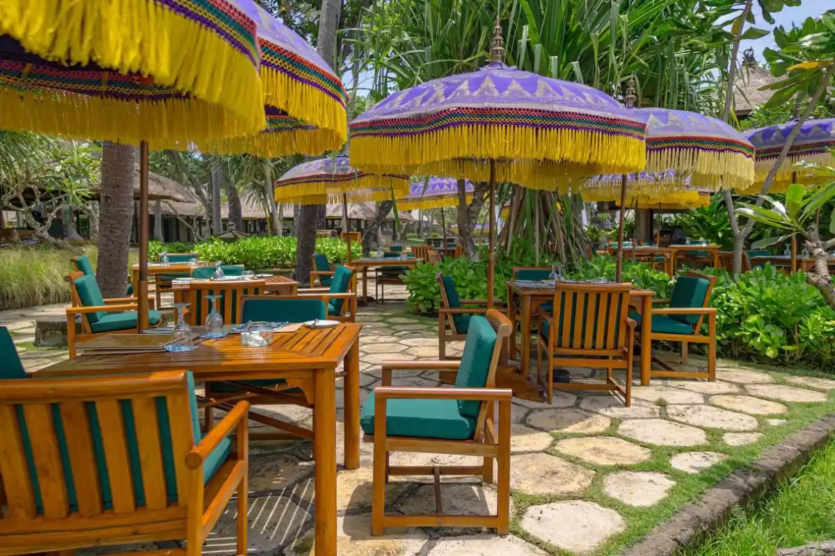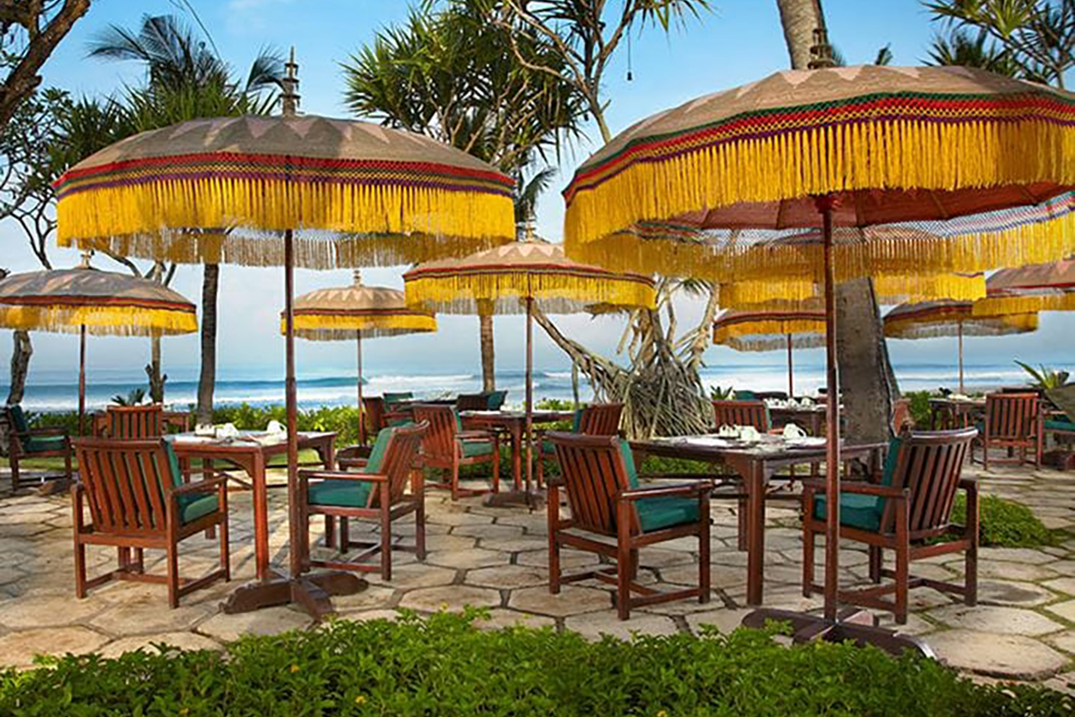Hal pertama yang akan terlihat saat memasuki Frangipani Cafe adalah payung-payung berwarna cerah yang menaungi setiap meja, dengan rumbai-rumbainya yang bergoyang tertiup angin laut. Hanya pepohonan kelapa yang menjulang tinggi, kembang sepatu, dan tanaman frangipani yang membingkai pemandangan laut, sehingga bersantap di sini bisa menjadi pelarian singkat dari dunia luar. Dari matahari terbit hingga terbenam, pengunjung dapat menikmati berbagai menu sarapan khas Amerika, Eropa, dan Asia Timur. Makan siang pun makin lezat dengan pilihan beragam, mulai dari sentuhan kontemporer pada pizza ala Napoli hingga hidangan spesial Indonesia dan Barat.
